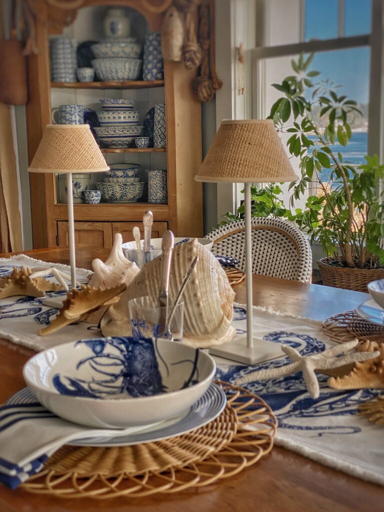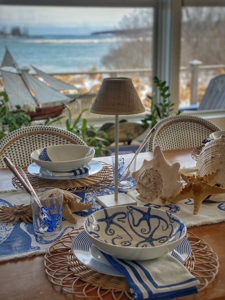 For the centerpiece I went full-on summer with simple cordless lamps with wicker shades, large seashells, and starfish. I usually use the view out my windows as inspiration, so creating something so out of sync with the season was an interesting exercise for me. I can’t wait to set the same table this summer.