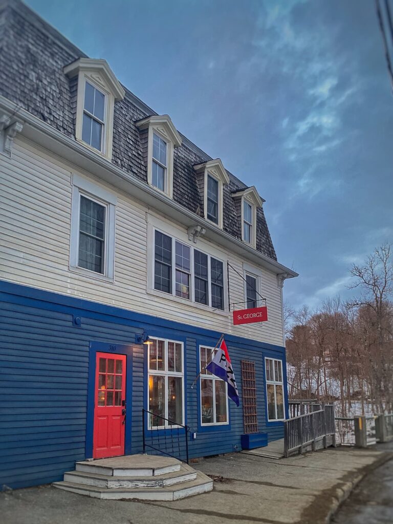 St. George Pizza is located in “downtown” Warren. To be clear, I have driven around Warren countless times but never realized it had a downtown. So I use the term loosely — there is a village green, a lovely stone library, an open-by-chance antiques store, a building under renovation, and next door, St. George Pizza, painted blue and white with a cheery red door.