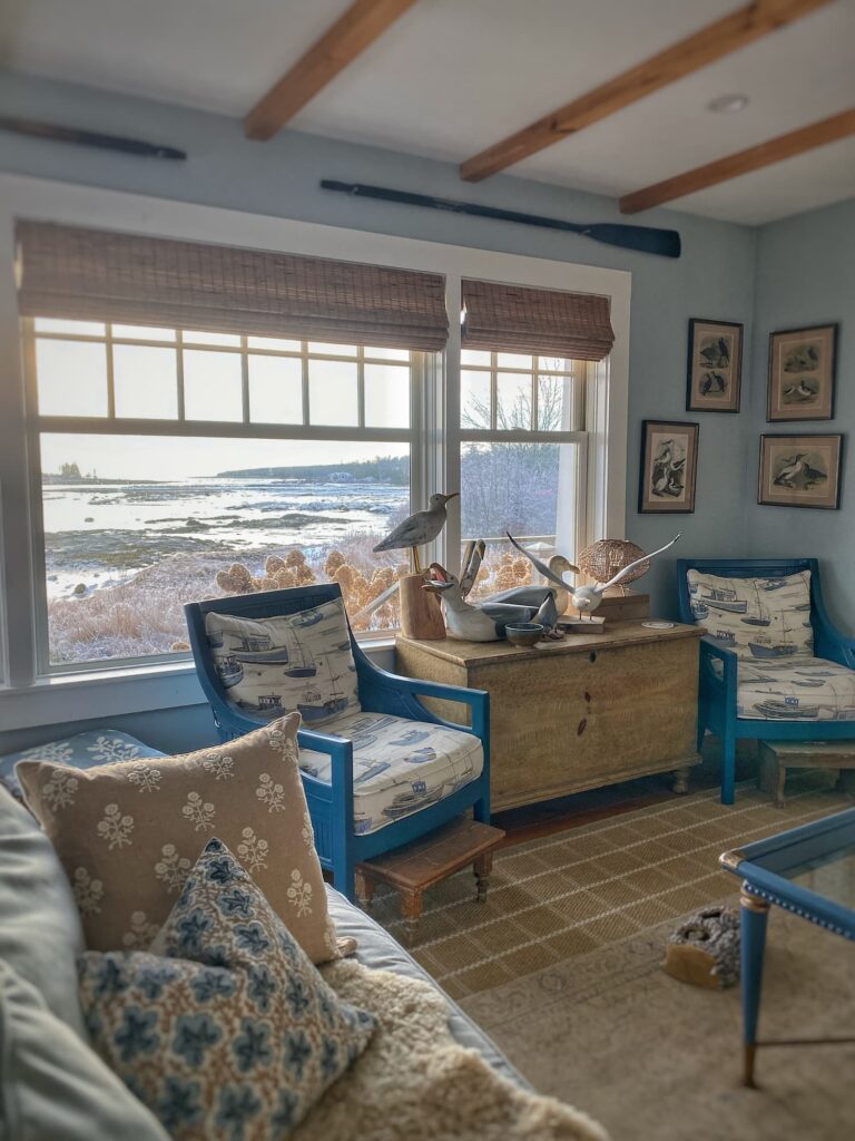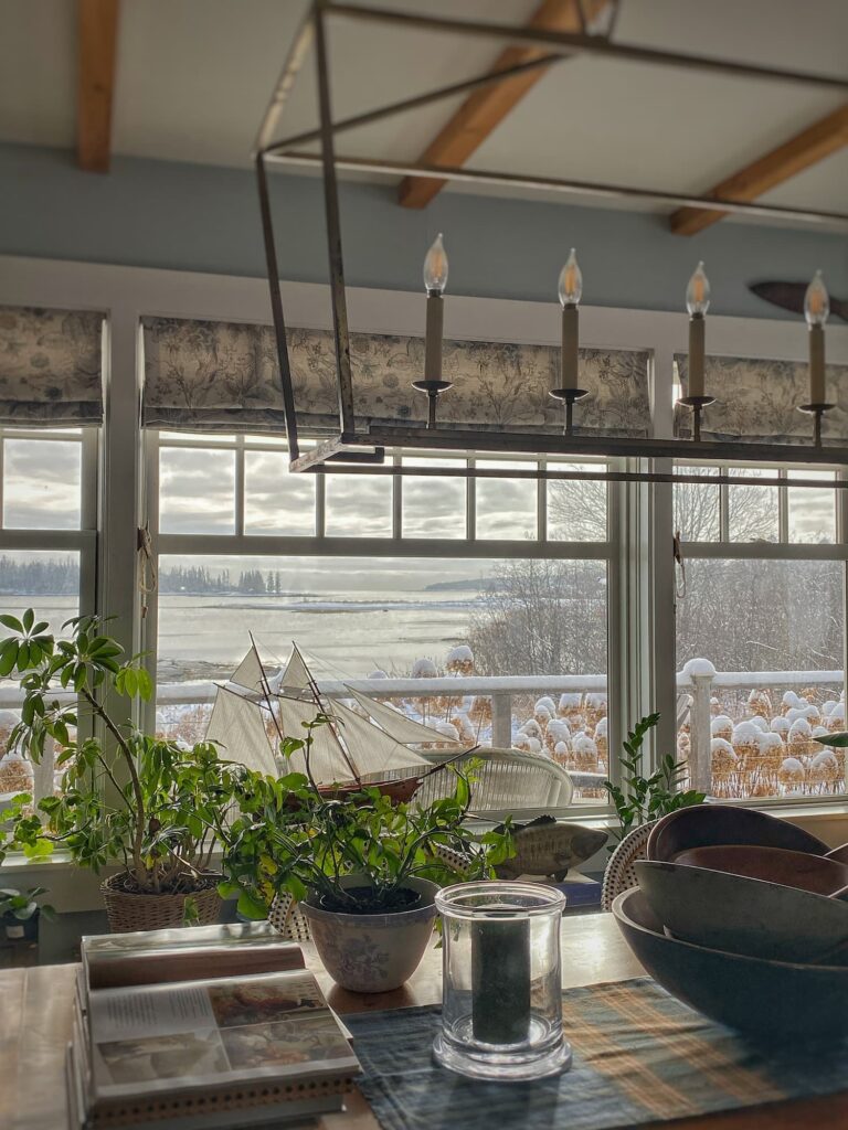 The same coastal Maine winter story carries over into the dining area, with pale blues, natural elements, and a few well-worn pieces that speak to winter enjoyed outdoors.