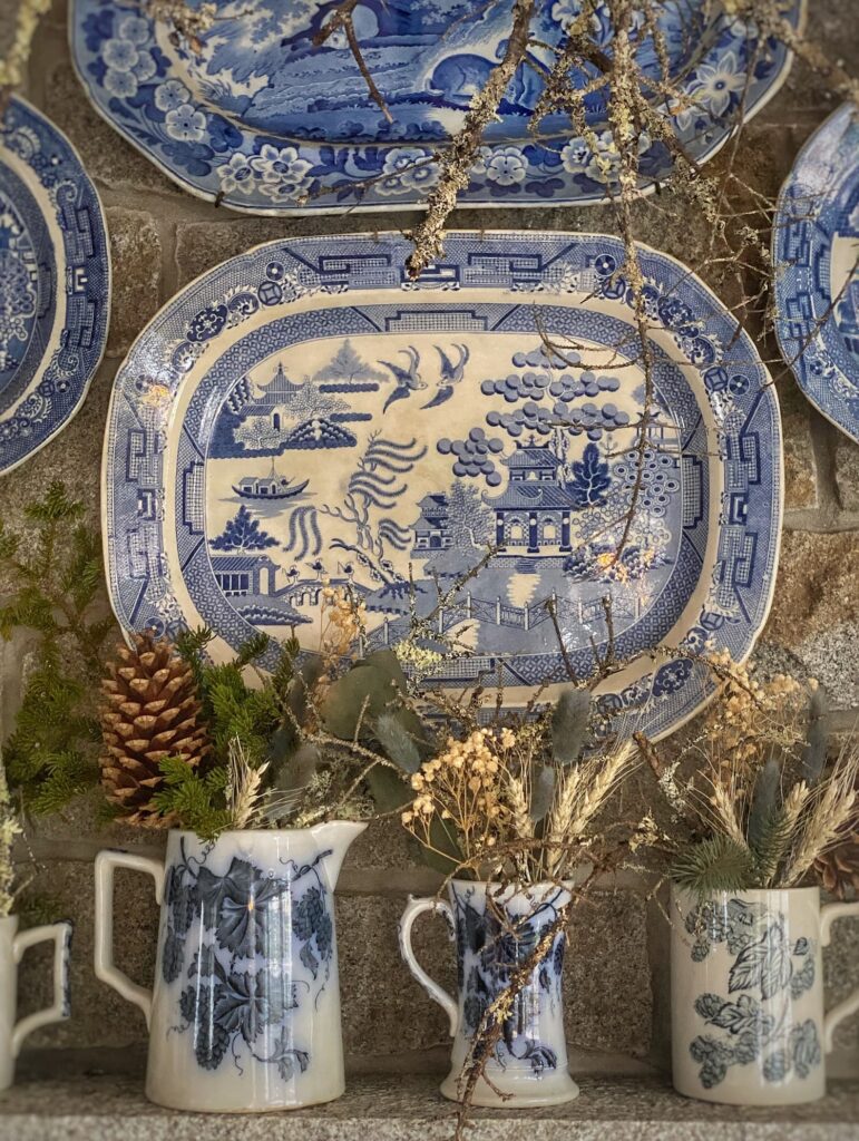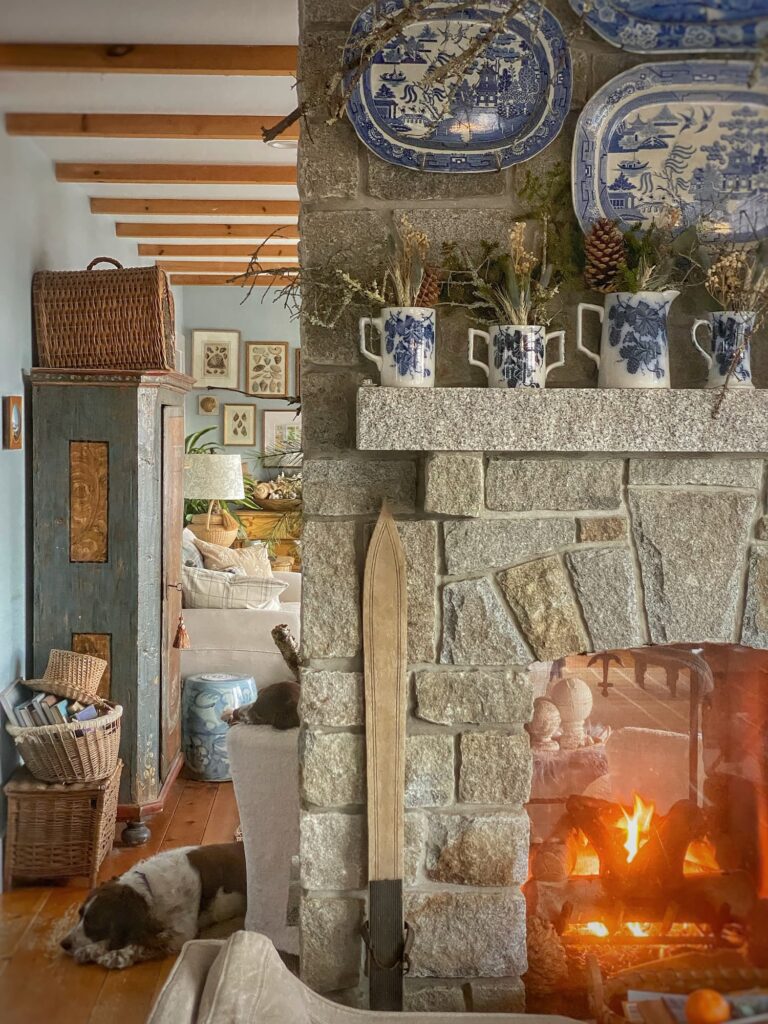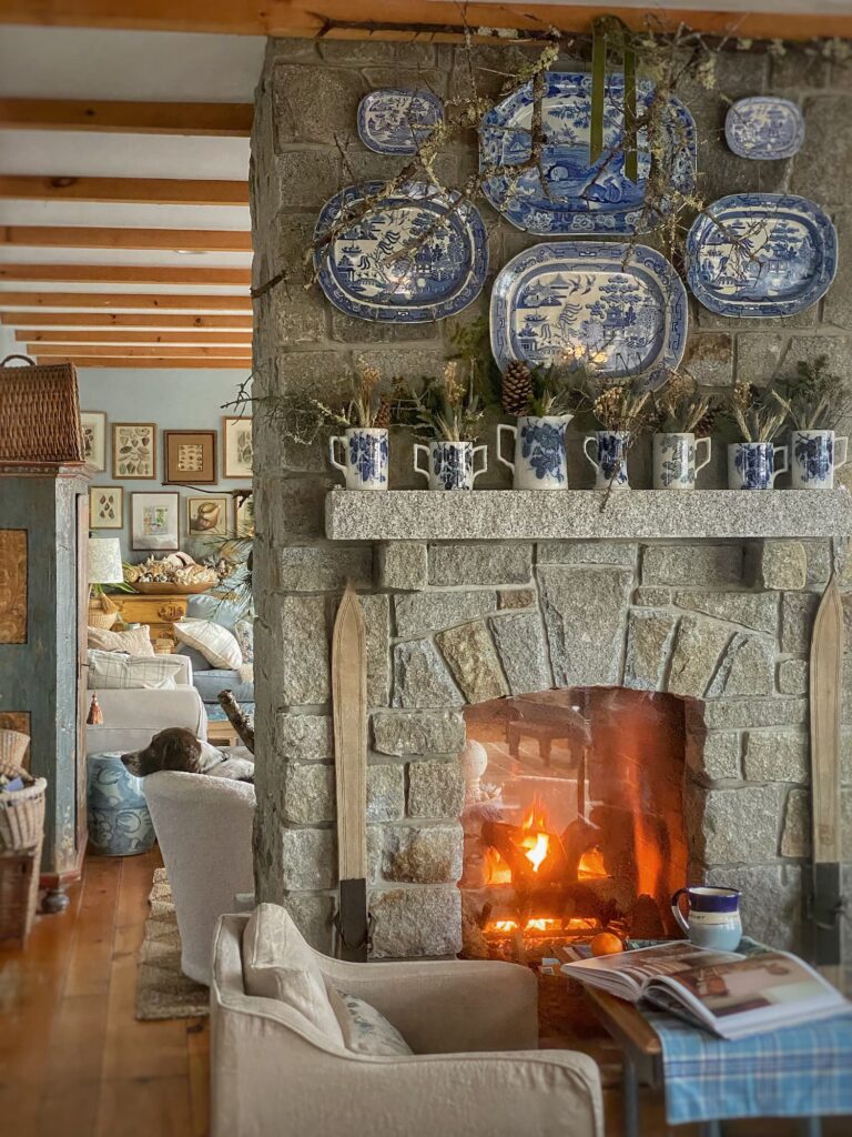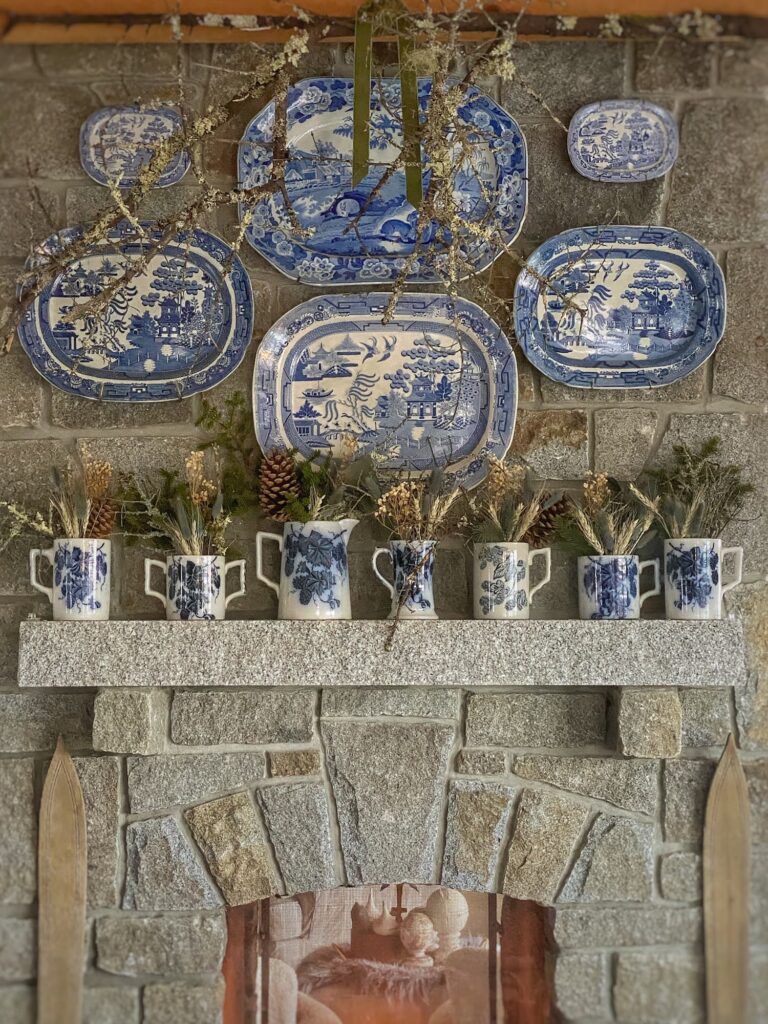 In place of the wreath, I hung a large branch — foraged on a walk in the woods with Maddie and Cisco — from the beam above the fireplace. The soft green lichens covering its bark give warm character to its stark silhouette, and its rustic feel contrasts beautifully with the refined blue-and-white transferware behind it.