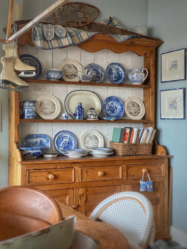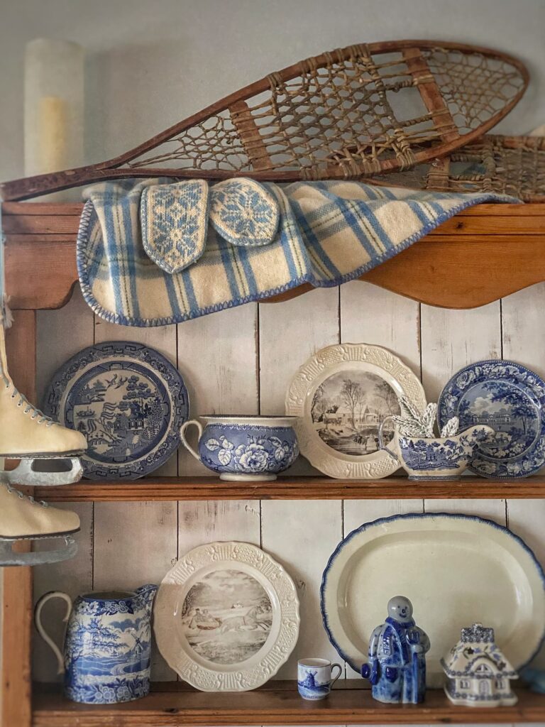My mom’s antique blue-and-white transferware dishes retain their starring role in the hutch. I did swap in a few vintage Currier and Ives plates with softly faded winter scenes — pieces I picked up at Elmer’s Barn back in early November. That’s also where I found the fireplace skis on a more recent visit. You can read about my November trips to Elmer’s Barn here — and if you look back, you’ll see how many of those finds made their way into my Christmas decor as well.