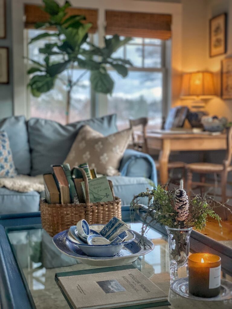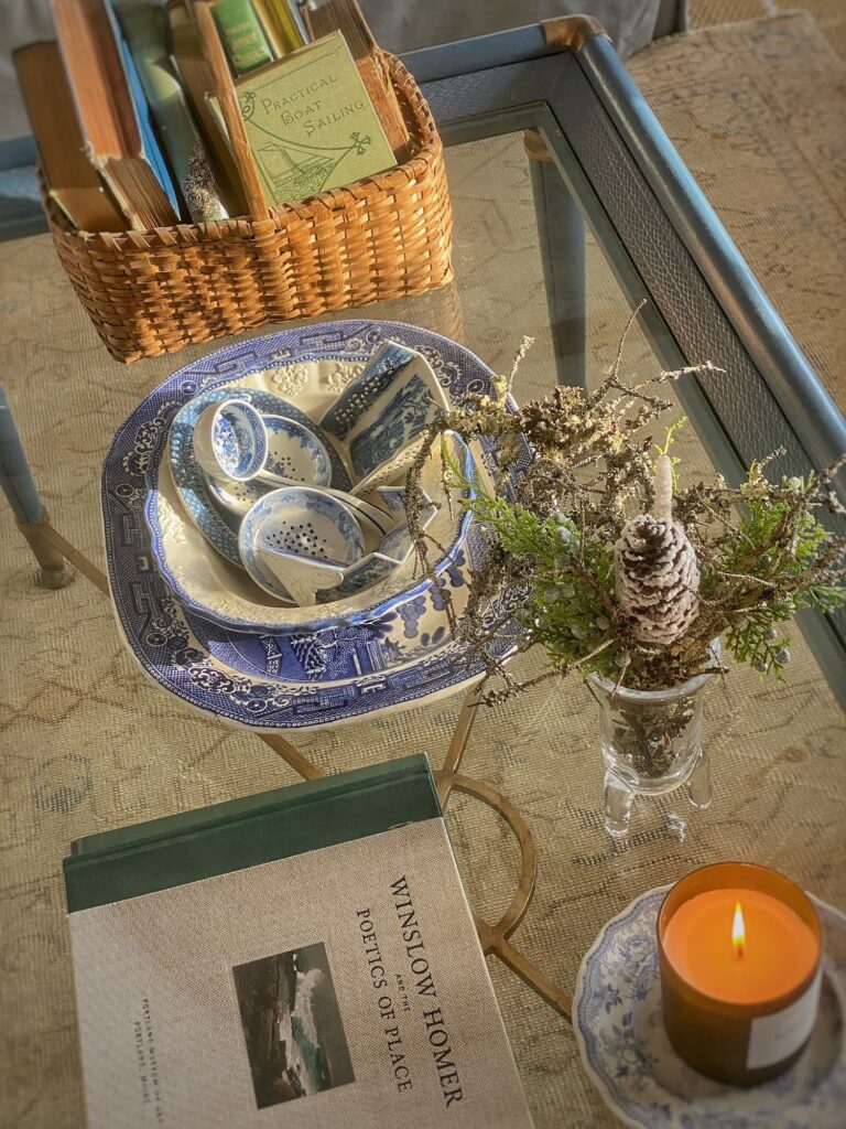 I decorate with blue year-round, but I especially love pale blues in winter. I moved a pair of stacked antique blue-and-white transferware platters — filled with small china pieces — from the side table next to the couch to the coffee table, and placed a small blue-and-white plate beneath the green candle.