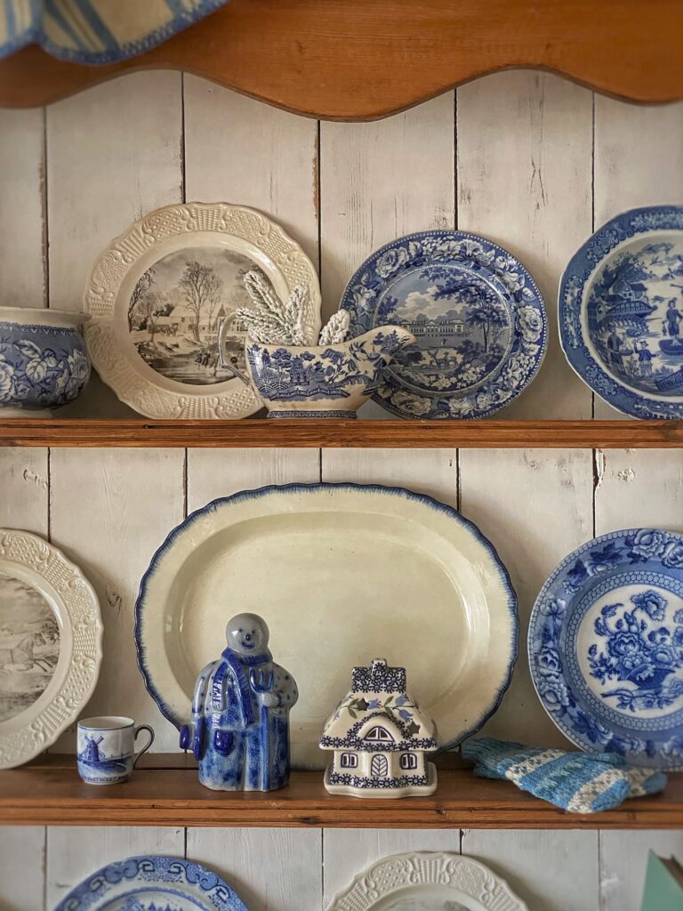 The pinecones, greenery, pottery Santas, and bottlebrush trees from Christmas have all been put away. For winter, I kept things simple — an Eldreth snowman, a small pottery cottage, and a transferware gravy boat holding a single flocked greenery tip.