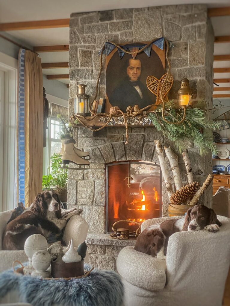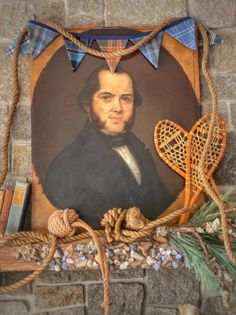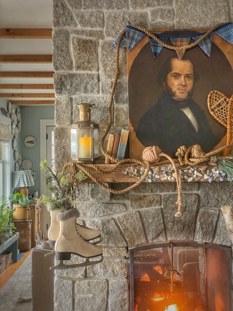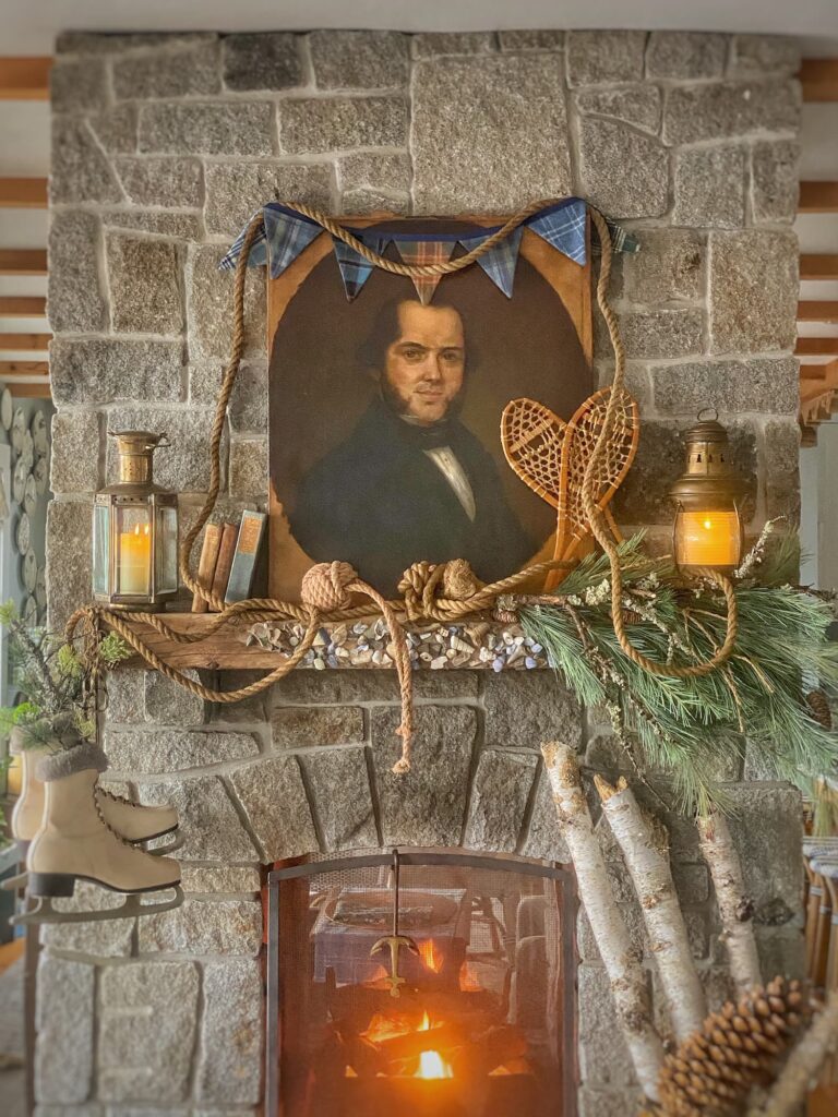 As a direct nod to outdoor winter activities, a pair of vintage fur-trimmed skates hangs from the opposite end of the mantel, and a small pair of wooden snowshoes leans against Captain Ward’s canvas. As a final touch, I pulled the flannel pennant garland from the top of my holiday hutch and draped it across the portrait.