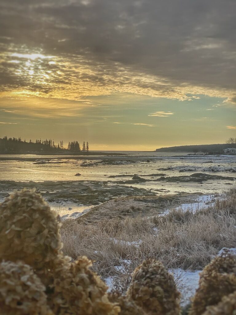 It was all over in a flash, and now I find myself back at home, ready to embrace the quiet of January on the coast. Winter is its own distinct season here, apart from the holidays — marked by faded colors outside my windows, ice-covered rocks at low tide, snowy caps on dried hydrangea blooms, and the flap of duck wings echoing across the harbor as they suddenly take flight.