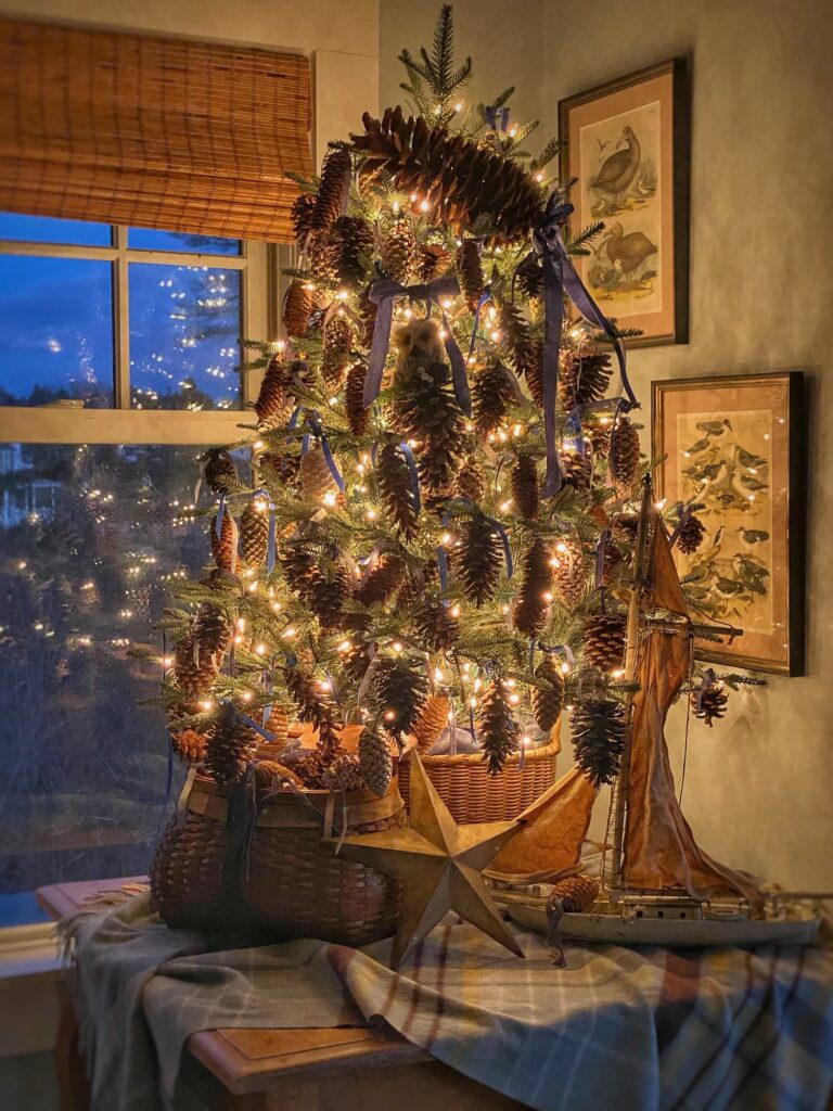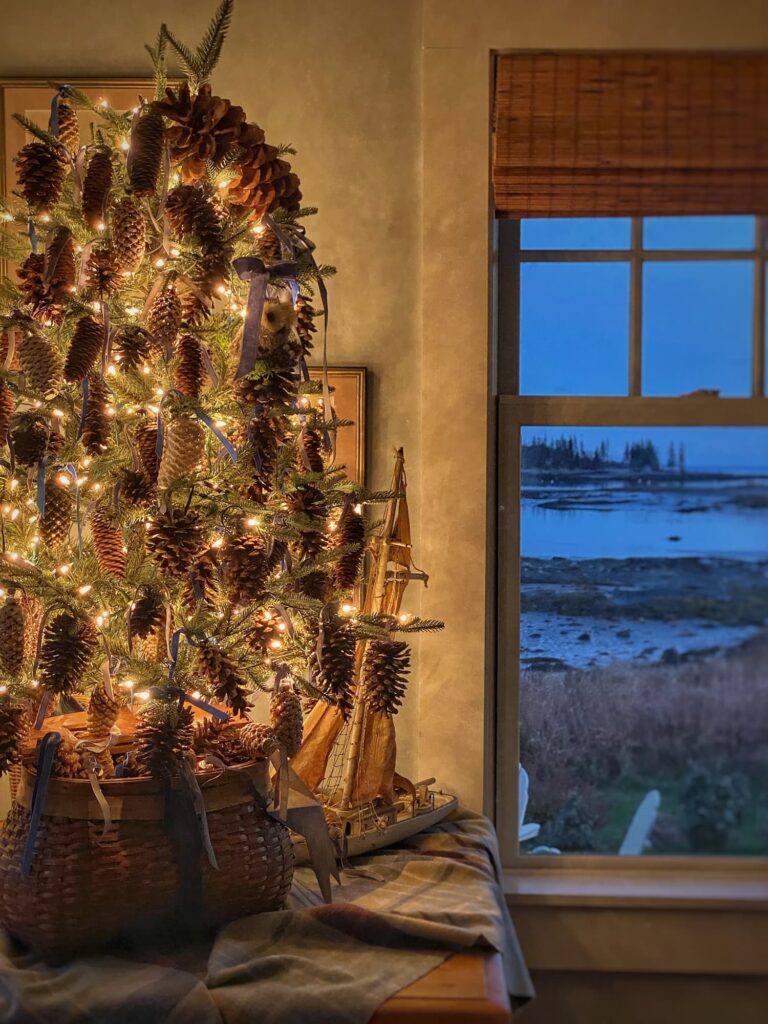 For more impact on a smaller tree, I added a couple of extra strings of twinkling lights and really loaded it up with ornaments — the real and Old-World-style glass pinecones tied with blue velvet ribbons that have become my signature look. Natural, with just the right touch of elegance and sparkle. Perfect for my cottage by the sea in the Pine Tree State. (Fun fact: Maine’s state “flower” is actually the white pinecone!)