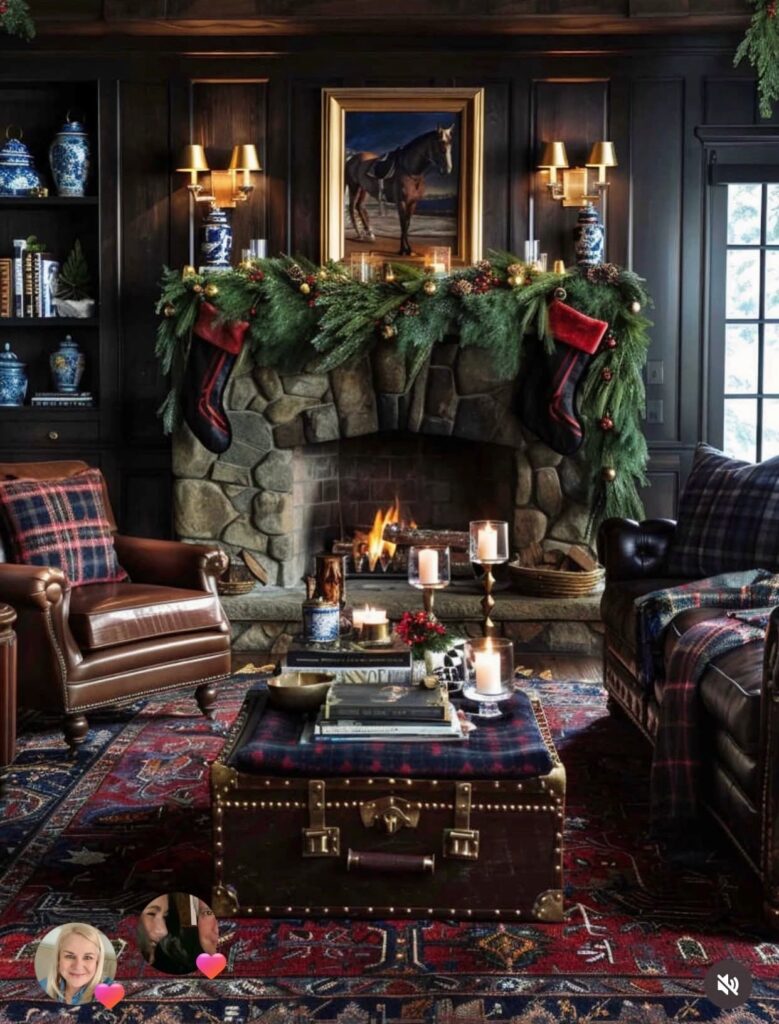 Have you heard of the Ralph Lauren Christmas aesthetic that’s trending all over social media this year? It’s characterized by everything in that photo: deep reds and greens, classic plaids, leather, brass, abundant greenery, and cozy candlelight — a blend of heritage Americana, old-world luxury, and lived-in comfort.