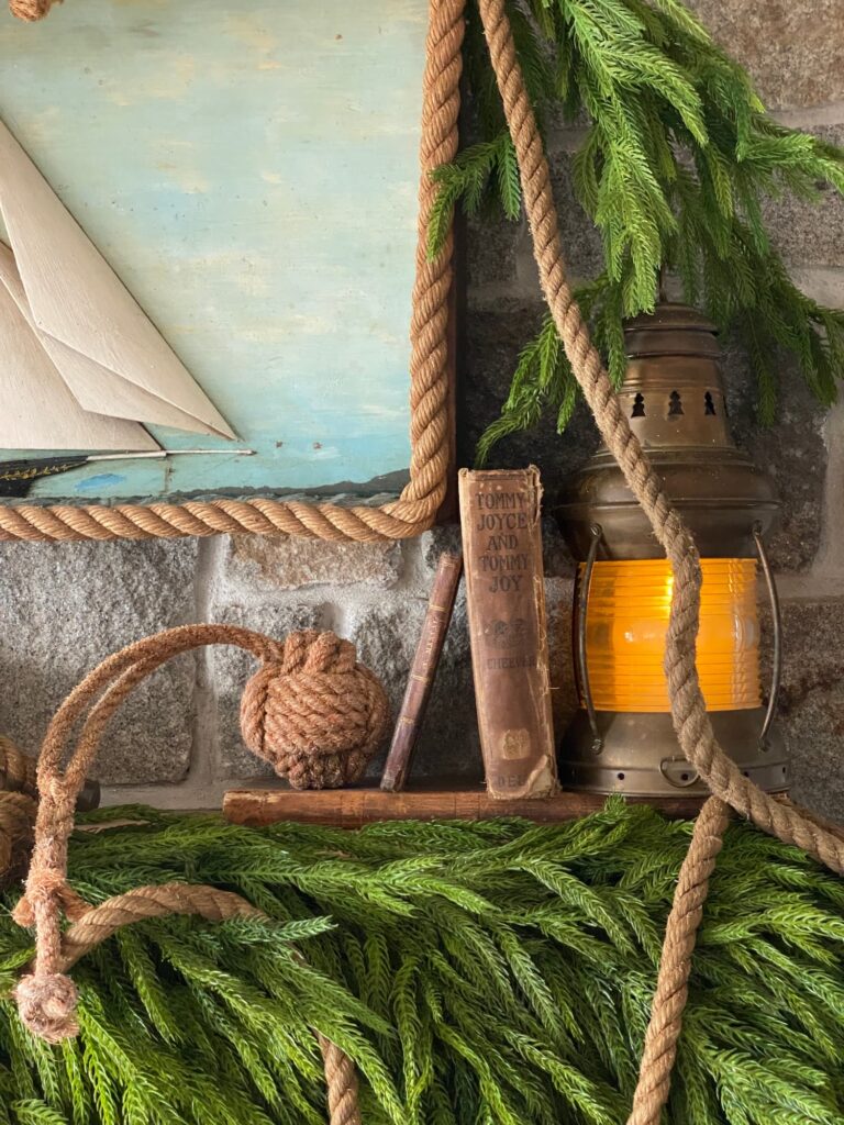 The focal point — the ship diorama — was already in place. A trip to a favorite antiques spot earlier in November provided two key pieces: a brass ship-style lantern and a length of old jute rope. (You can read more about that outing, including what else I brought home, here.)