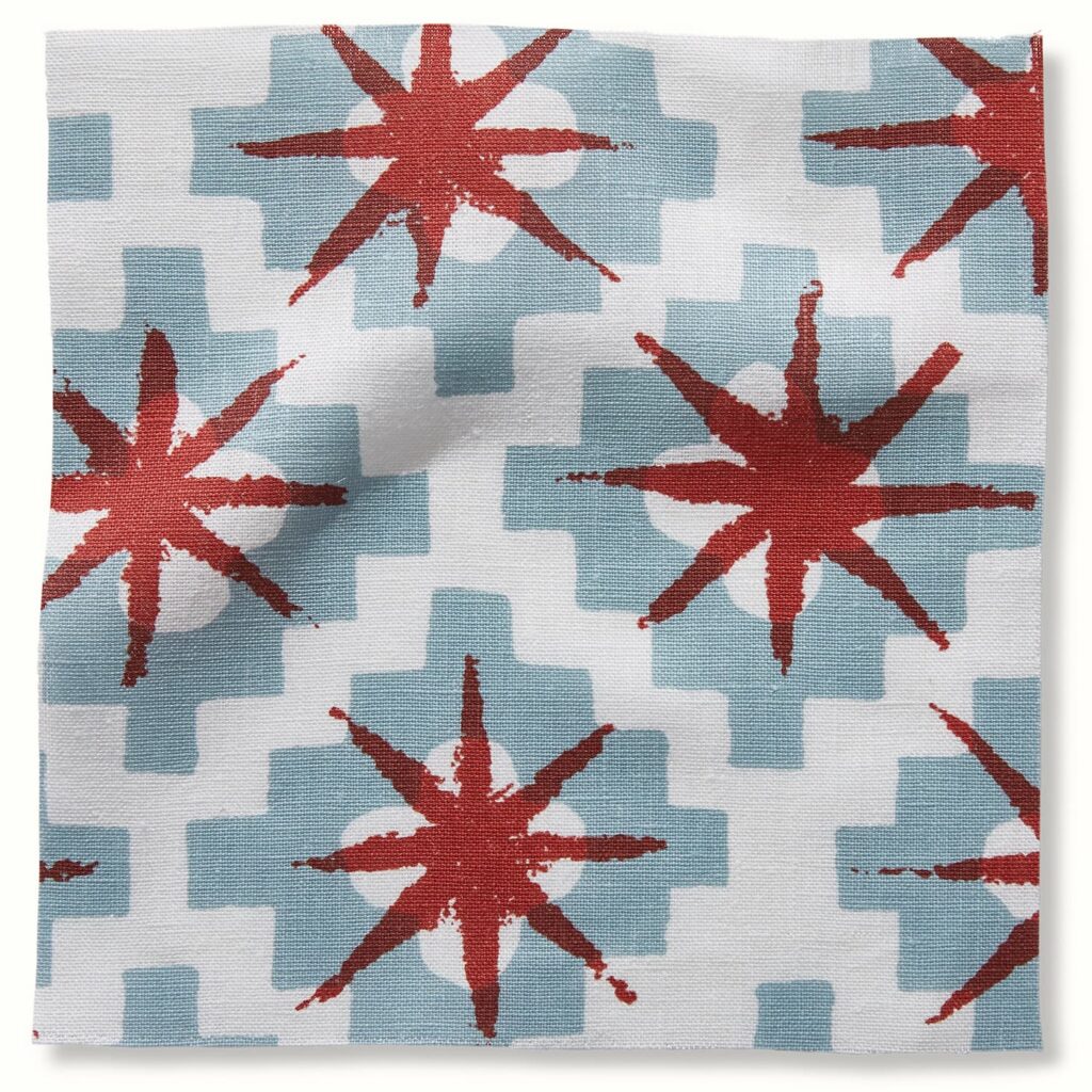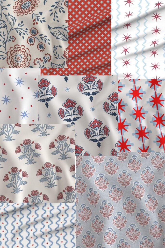 I quickly pulled together a mix of different patterns in shades of red, white, and blue — one even similar to the too pricey Peter Dunham starting point of all this madness. Yes, there is a decidedly patriotic theme to my choices, but I think the stars have a nautical feel too. I’m going to order some samples and see how they work in the space. Stay tuned!