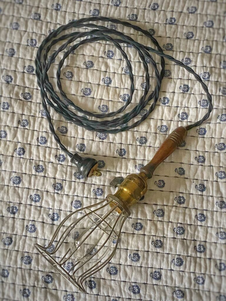 One of the dealers had a grouping of old work lights — the kind with an exposed bulb protected by a wire cage and a handle, often with a ring for hanging. A long electrical cord extends from the top.