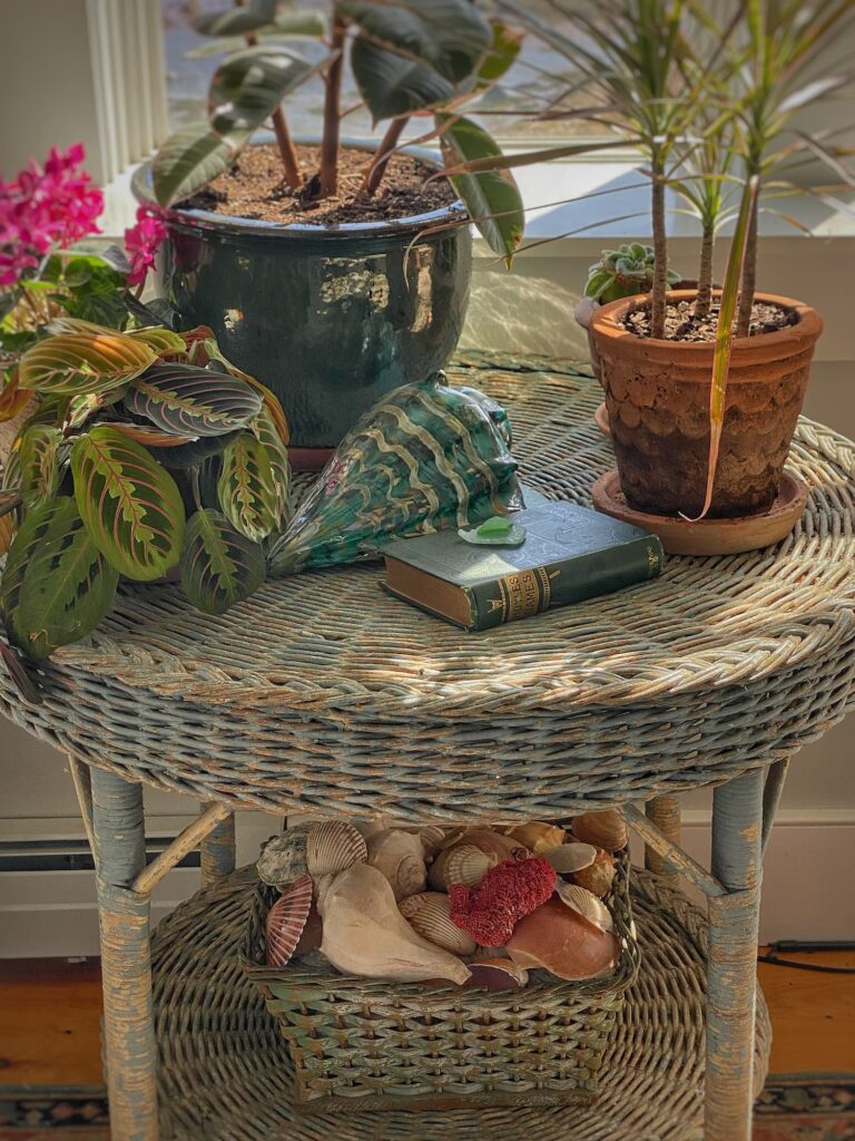 So when I saw a chippy teal-painted basket filled with shells, it was a no-brainer. I already knew exactly where it would go — on the bottom shelf of the wicker table in my bedroom reading nook. I tried styling it with a few other things, but I like it best as a simple statement on its own.