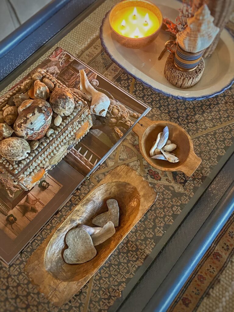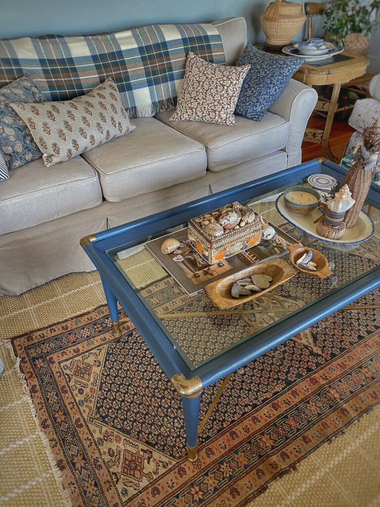 This old Persian rug has lived in several spots around the house (including the downstairs bath), but its palette of beige, dark blue, and rusty brown makes it perfect for fall. It grounds the space beautifully—and I love how the glass-top coffee table lets the pattern show through.