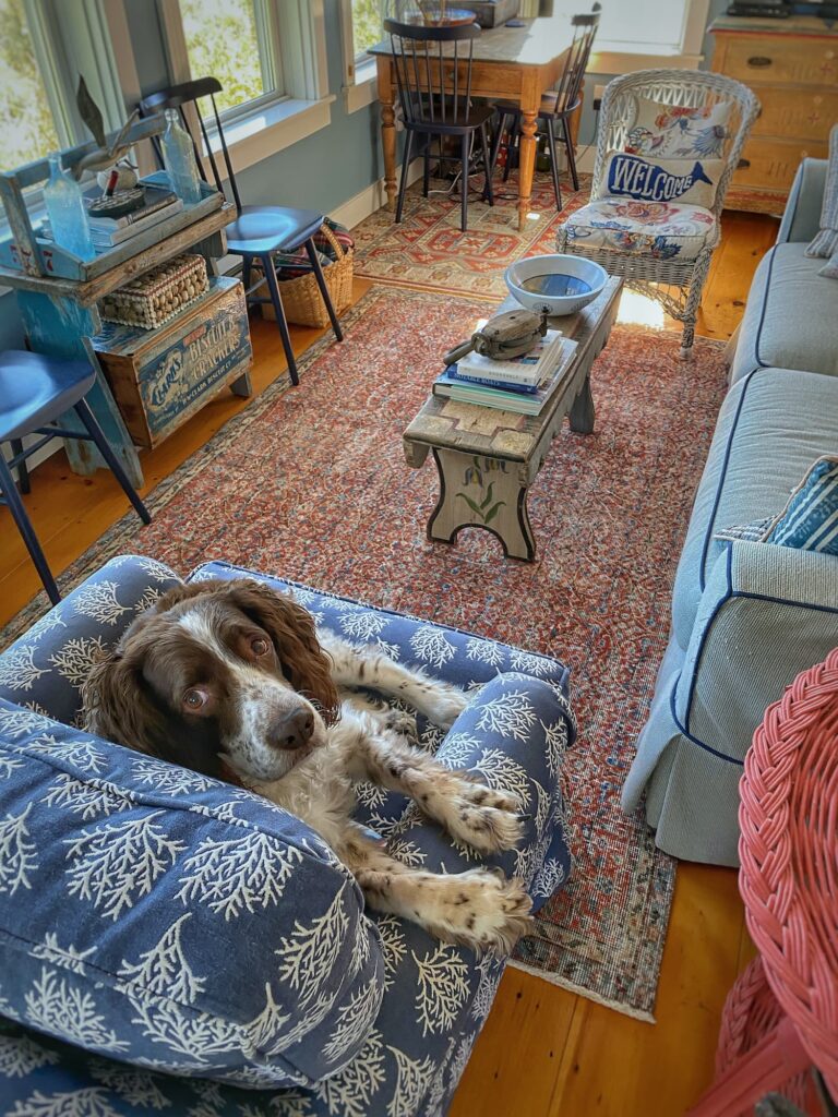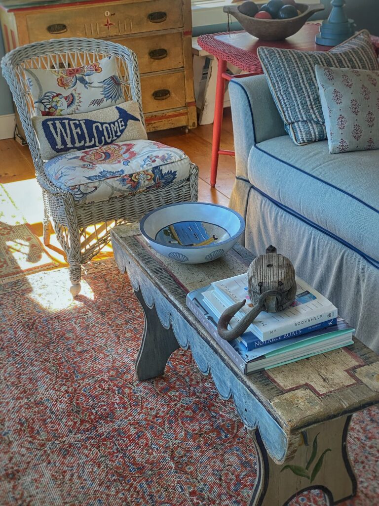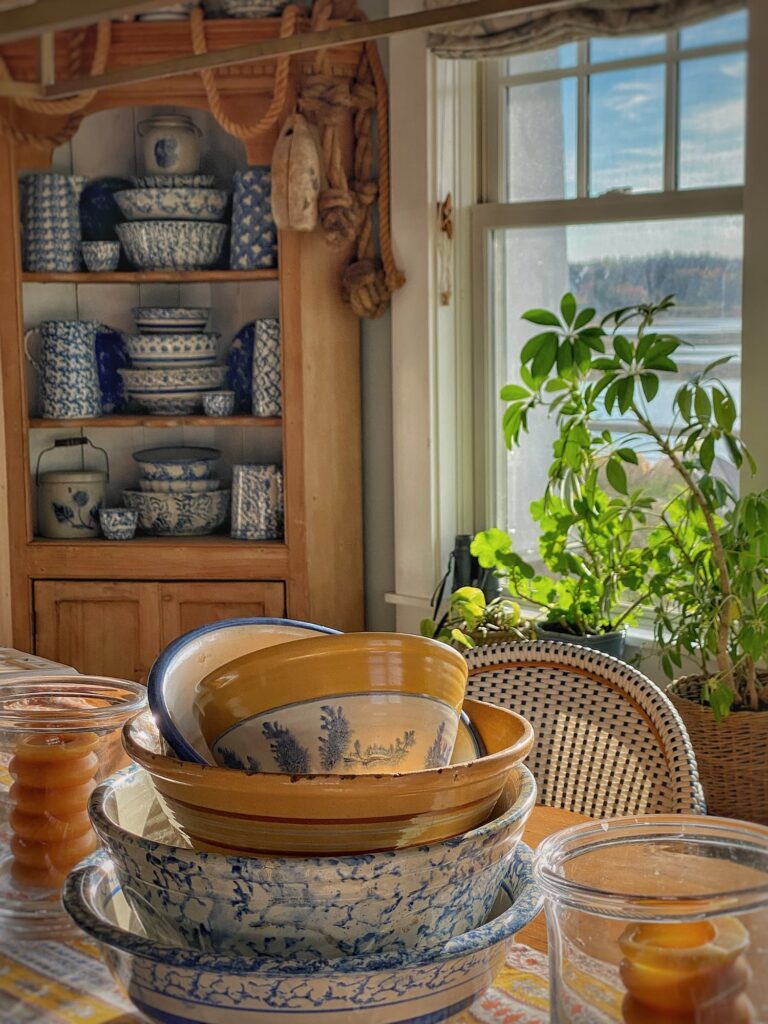 Antiques in Cornish, a seaweed mocha yellow ware bowl, my Great Pumpkin Wall, and a cozy cottage rug — welcoming October in Maine style.