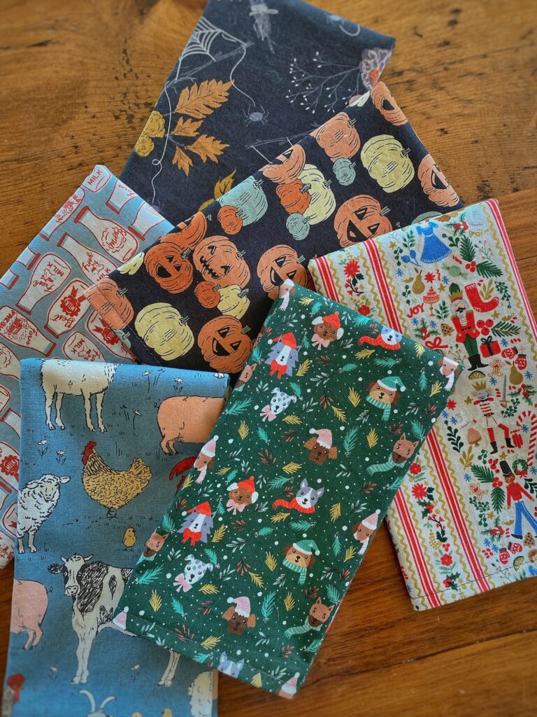One little project this week was sewing cloth napkins for my grand-toddlers and popping them in the mail. It always brings me joy to write their names on the address label. The napkins turned out so cute — each is two-sided with coordinating seasonal fabrics. Milk bottles and farm animals, pumpkins and a cobweb-laced floral, and Christmas pups and the Nutcracker (my daughter Zoë danced in the Nutcracker for many holiday seasons).