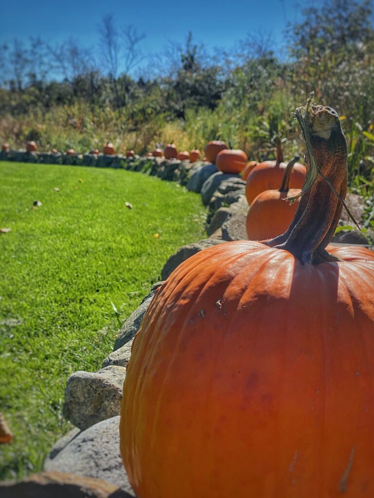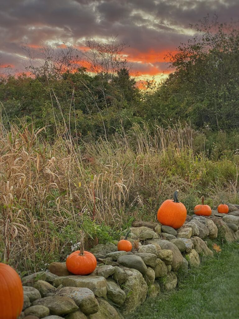 The display couldn’t be simpler, but when I pull down the driveway or catch a glimpse of those vibrant orange pumpkins lined up against the stone and fading grasses, it makes me smile. A celebration of fall abundance — and a nod to Halloween too.