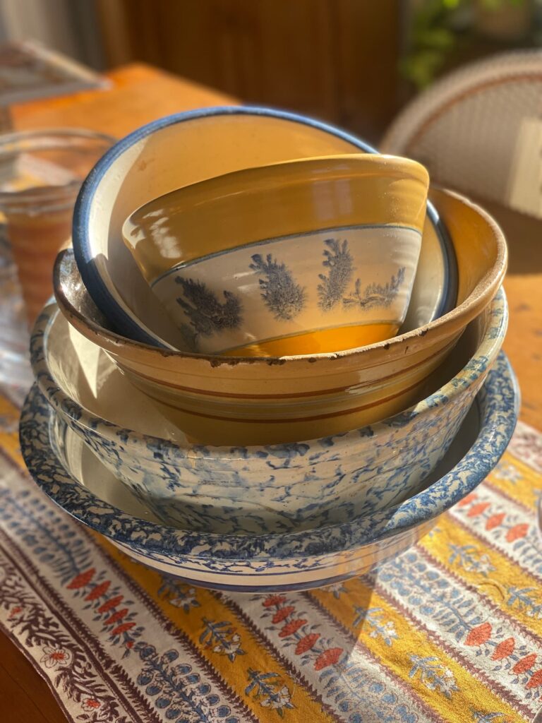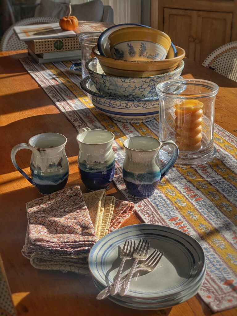 The bowl makes a perfect addition to my stack of pottery bowls on the dining table, mixing and matching with antique spongeware and one piece of old yellow ware. The golden hues add fall warmth to my signature blues and coordinate perfectly with the Couleur Nature floral table runner I bring out this time of year.