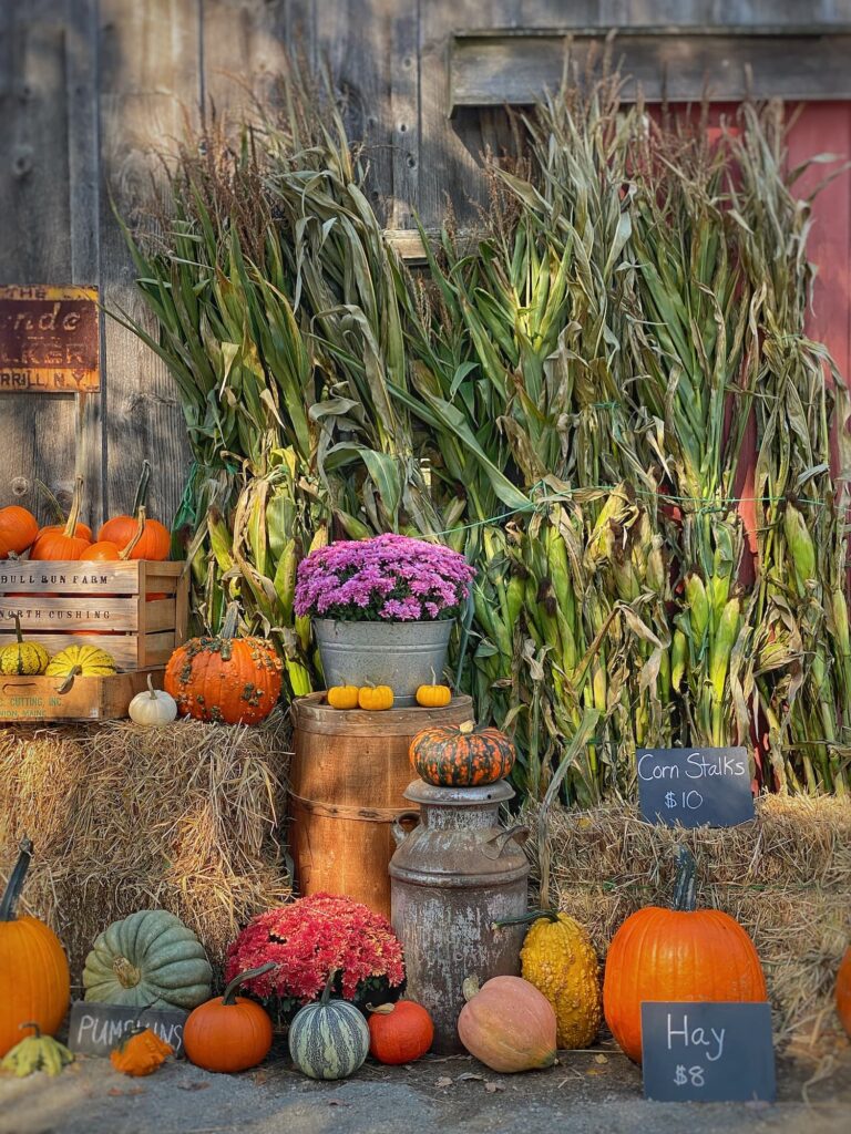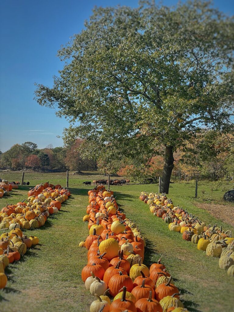 So last Sunday I headed over to Bull Run Farm in Cushing and loaded up 29 beauties. Nick, the owner, prides himself on growing the best and newest varieties — yellow, green, and multi-colored, fairytale, warty, and stacking pumpkins. For the wall, though, I stick with the classics: cheerful, round, and orange. And there are always plenty of those too.