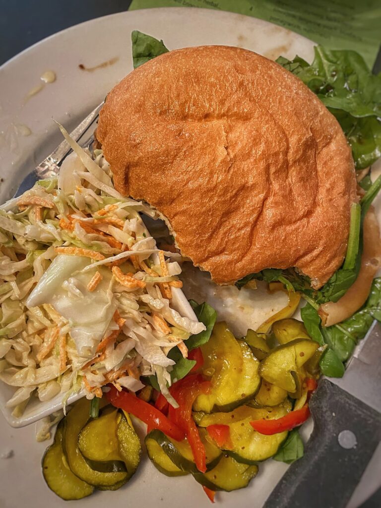 We kicked things off with lunch at Krista’s Restaurant, a cozy, eclectic spot with a warm and welcoming vibe — casual, but with plenty of playful character. Their menu mixes comfort food and creative dishes, with daily specials and house-made desserts. My friend is gluten- and dairy-free, and I’m a vegetarian, and we both found plenty of options. I ordered the portobello sandwich — artichoke heart and olive relish, tomato, roasted garlic aioli, melted Swiss cheese, baby spinach, and a balsamic drizzle. It was flavorful, hearty, and anything but ordinary.