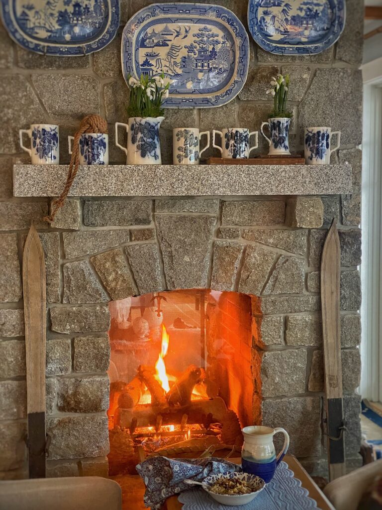 After living with it for a few days, though, I realized it needed the smallest nod to what’s ahead. So I added a blue-and-tan striped lusterware mug holding a sprig of faux snowdrops — the first flowers to bloom after winter. That simple addition brought the mantel gently to life, a quiet reminder of the abundance to come.