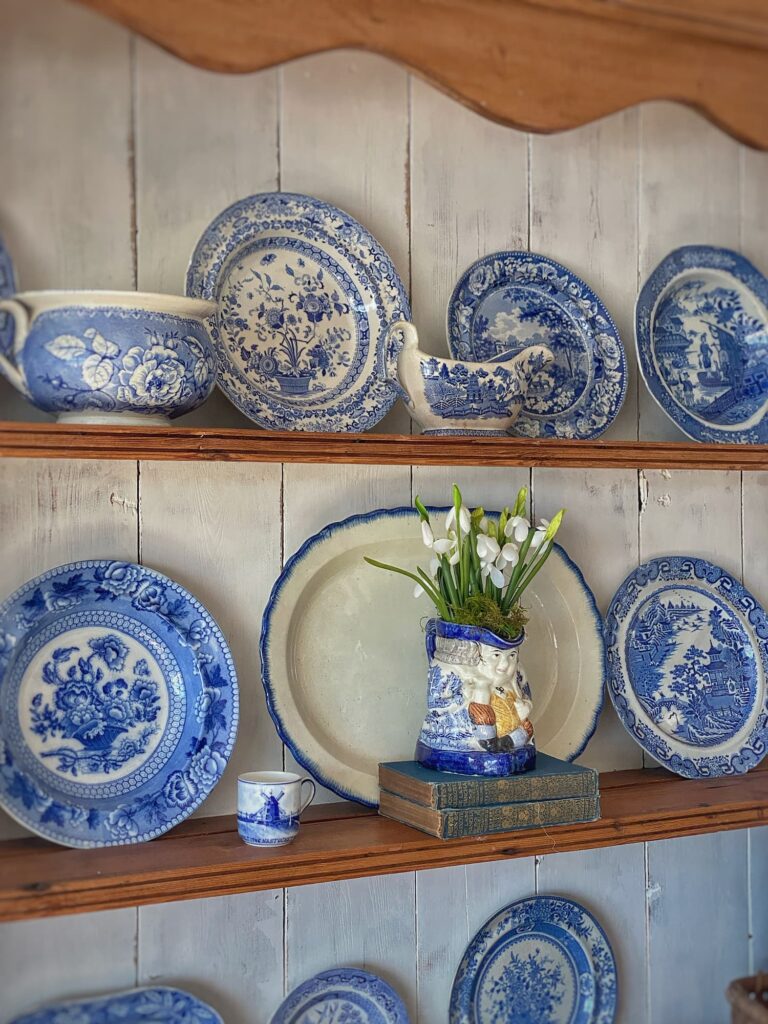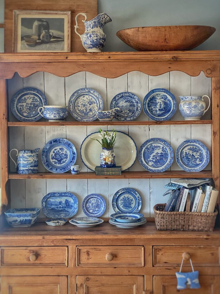 At the center of the hutch — set on a stack of blue books and anchored by a solid white platter with a feathered blue border — sits the guest of honor: the wonderful blue willow Toby jug I shared on the blog last week.