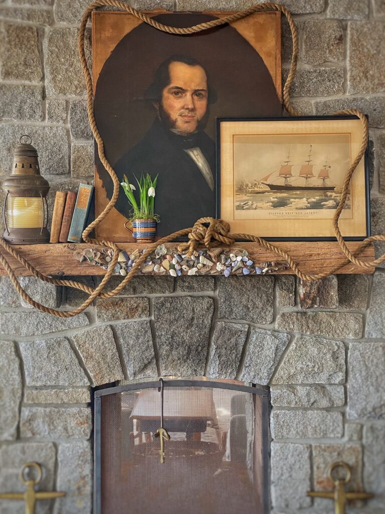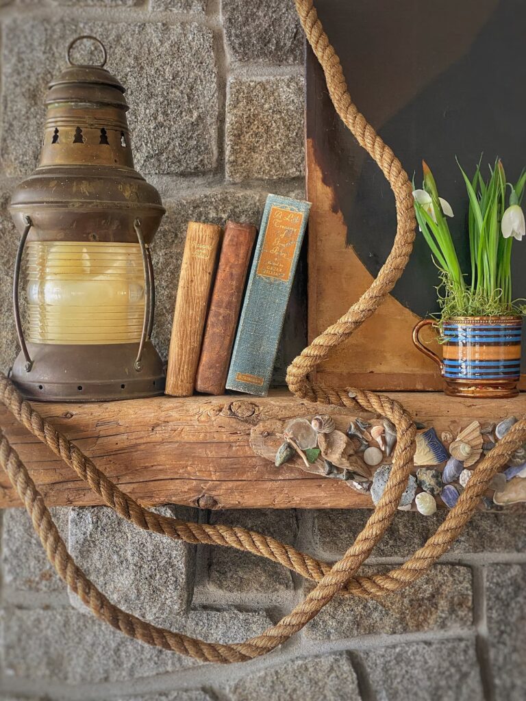 More recently, as we move toward early spring, I pared the mantel decor back even more. I put away the greenery, snowshoes, skates, and bunting. A graphic vintage ship etching, leaning against the portrait, replaced one of the lanterns. The portrait, rope, a single lantern, and the books remained. The overall effect felt quieter and more restrained — fitting for this in-between season.