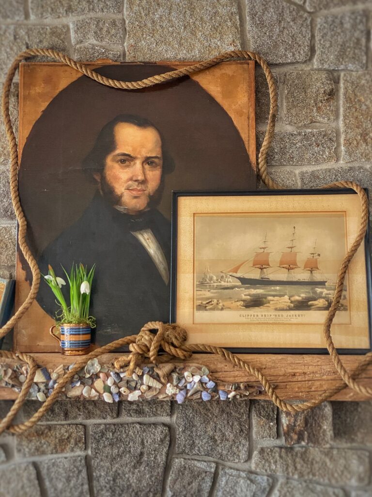 In January, I removed most of the greenery and replaced it with a simple spray of evergreen and lichen-covered branches on one side. The diorama gave way to an antique portrait — Captain Ward, as you all know him — and I added a few wintry touches: small snowshoes and fur-trimmed ice skates. For color and a bit of whimsy, I draped a plaid flannel flag bunting across the top of the portrait. The lanterns, books, and nautical rope remained.